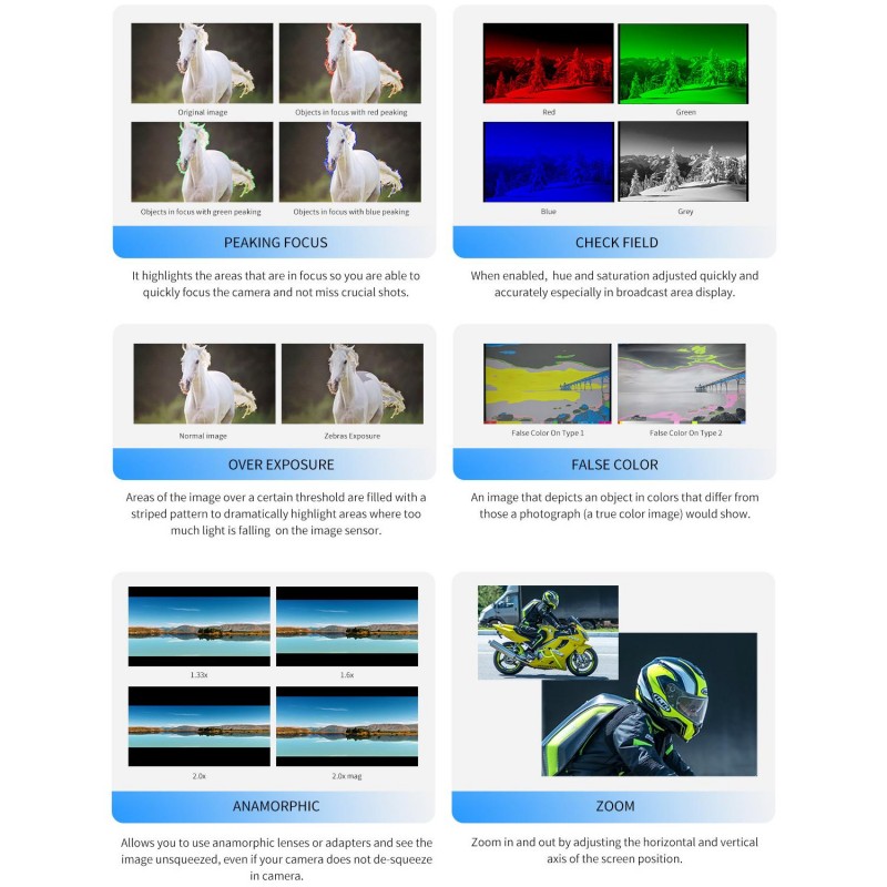 6. With Waveform, Vectorscope, RGB Histogram, Focus Assist, Monochrome etc. functions, can help you accurately exposure and focus every shot.
