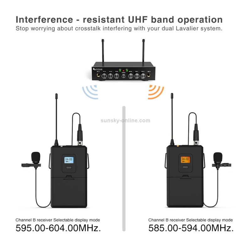 1. Fast and easy wireless synchronization. Quick & easy frequency matching.Supports up to 20 simultaneous wireless channels in the same frequency band.Dual frequency design (channel B/C),provides a clear, static-free transmission.Stop worrying about crosstalk interfering with your wireless microphone lavalier