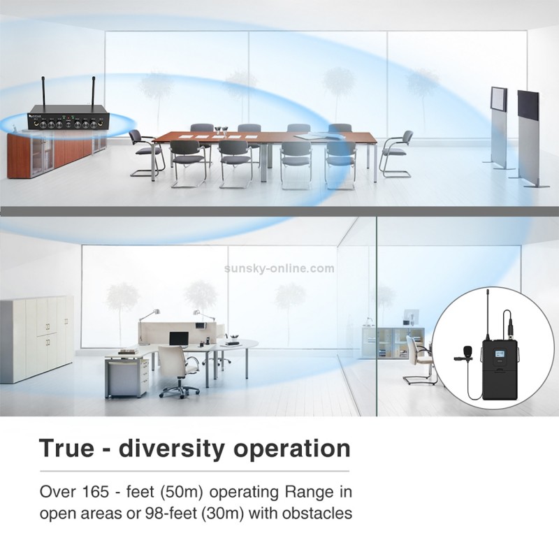 2. Wireless microphone system use two separate antennas on both transmitter and the receiver to maximize signal integrity,reduce the chance of dropouts occurring.Ideal for various locations that have structures block or deflect wireless transmissions.Over 165-feet (50m) operating range in open areas(line-of-sight) or 50-feet (15m) with obstacles.