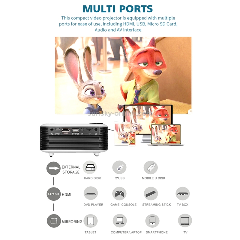 Description 1. Brightness: 1000 lumens 2. Contrast: 1000:1 3. Display ratio: 4:3/16:9 4. Projection size: 14-100 inches..