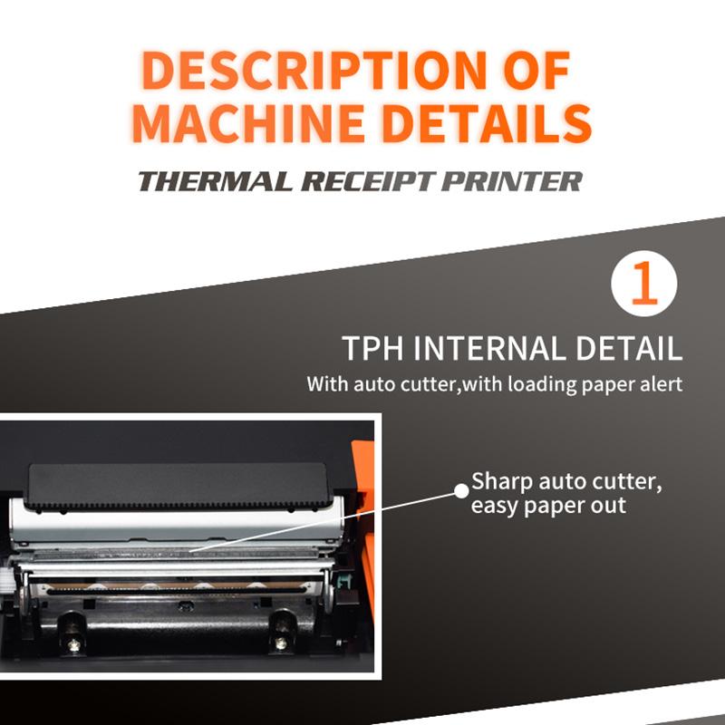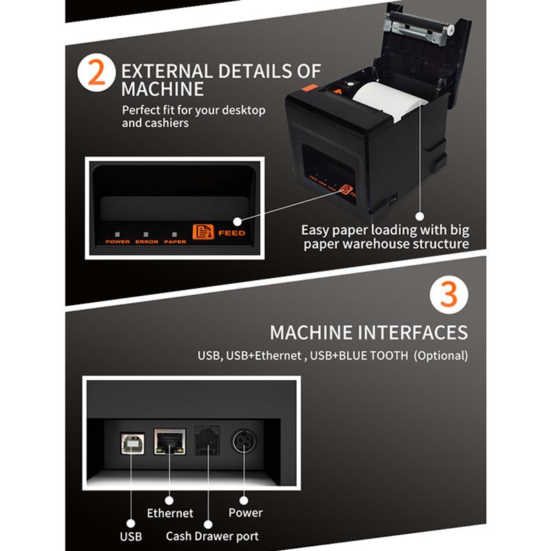 2. High printing quality, low cost, low noise, high speed printing, support cash drawer driver language: support multiple languages
