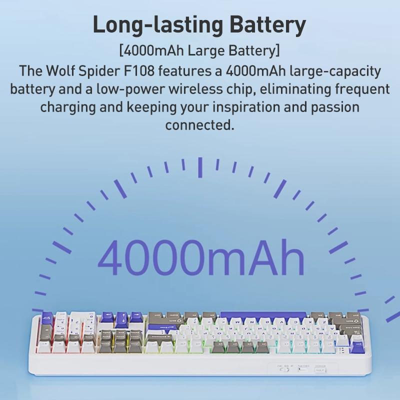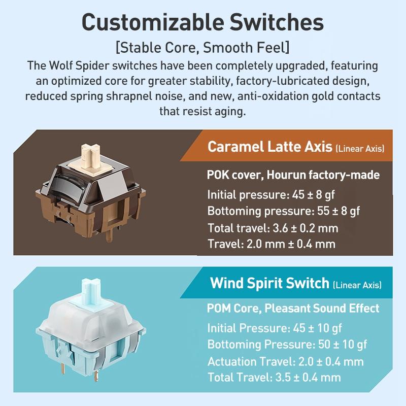 Description 1. Switches: Caramel Latte Switches/Wind Spirit Switches2. Connection: 2.4G/Bluetooth/Type-C Wired3. Battery Capacity: 4000mAh4. Lighting Type: RGB..
