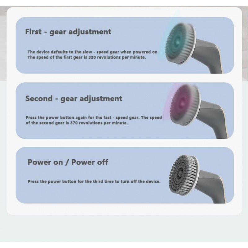 2. Features two-speed settings (low 320 RPM /high 370 RPM) for customized cleaning intensity across different surface types