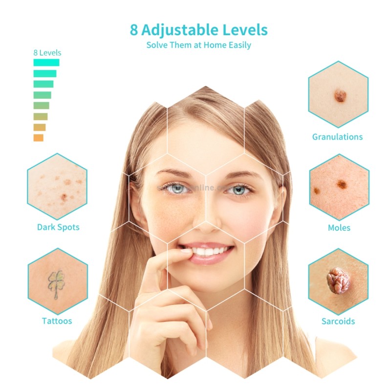 2.Easy & Effective to Use: the mole remover has 8 levels. Just press the power button to choose levels. Simple operation brings effective results. LED spotlight also helps aim at ark spots accurately.